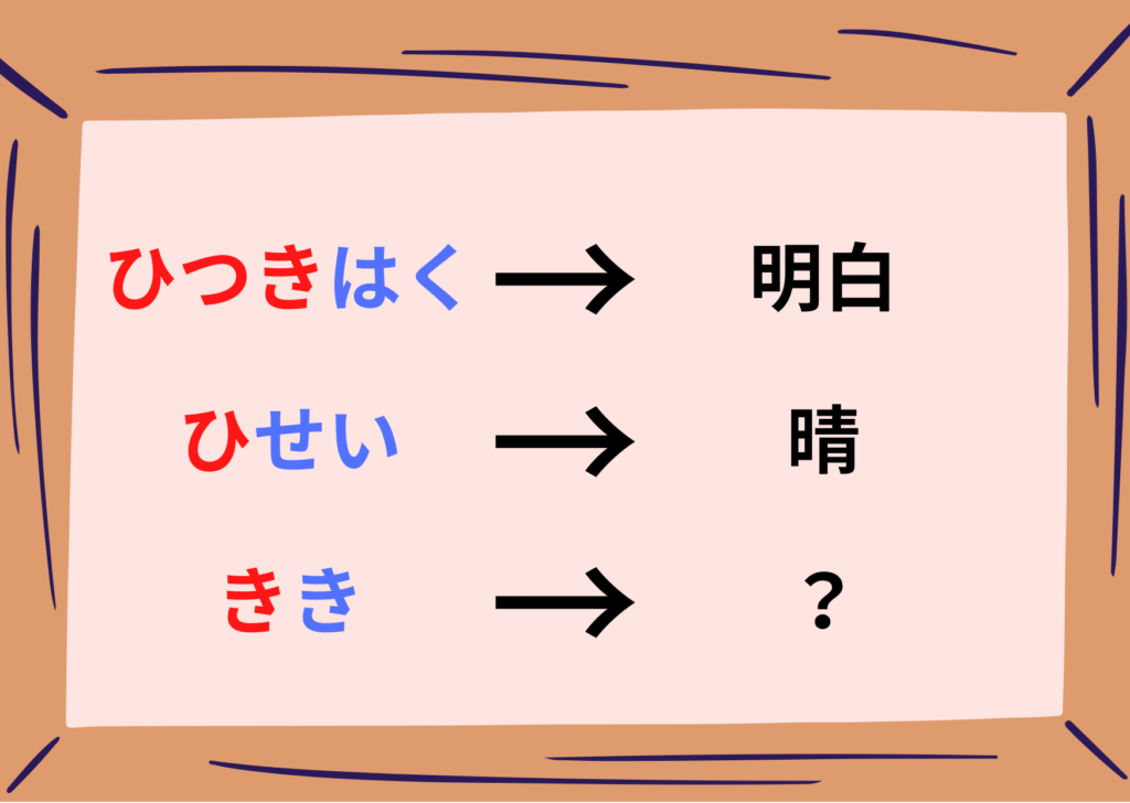ホーム謎解き 謎解き第2問 2021年4月18日2021年5月19日 ?に入る漢字は何? 答えを見る 答えは横 解説を見る 赤い文字は曜日の漢字を表しています。青い文字は色の漢字を表しています。したがって、きは「木」を、きは「黄」を表します。 よって、?に入るのは「横」となります。 コメントを残す コメントをキャンセルメールアドレスが公開されることはありません。 ※ が付いている欄は必須項目ですコメント ※ 名前 ※ メール ※ サイト 次回のコメントで使用するためブラウザーに自分の名前、メールアドレス、サイトを保存する。